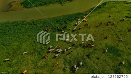 aerial photography ducumentary Herd of cows grazing on the meadow near the lake at sunset