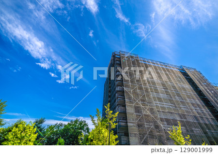 日本の横浜都市景観 夏空が広がる…マンションの補修や点検等、足場や防護ネットなどを望む=7月27日
