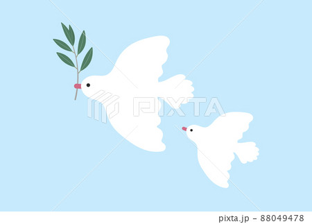 青空を飛ぶオリーブの葉をくわえた白い鳩の親子- 平和・Peace Day・停戦のイメージ素材
