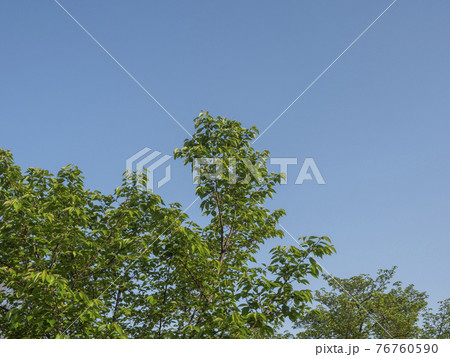 緑の葉を付けた樹木と青空の背景素材