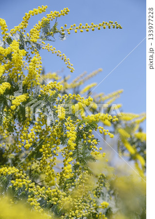 澄んだ青空に映える満開のミモザ
