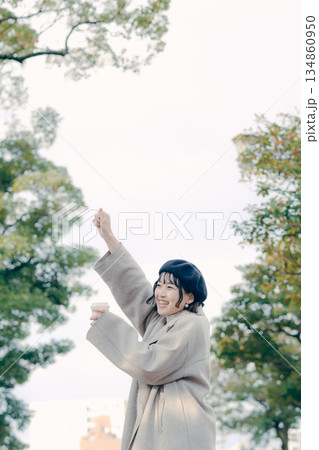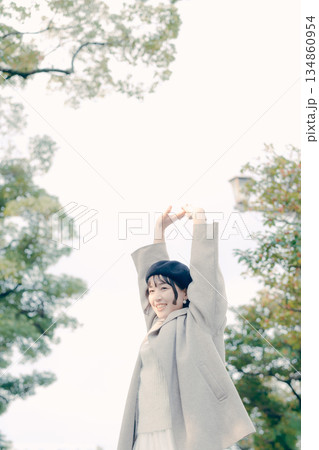 青空の下でリラックスして伸びをする30代女性のポートレート
