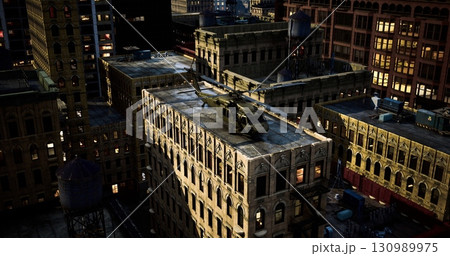 A helicopter touches down on the rooftop of an old building amidst a bustling city skyline at night. City lights shimmer, casting a dynamic glow on the surrounding structures and streets.