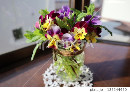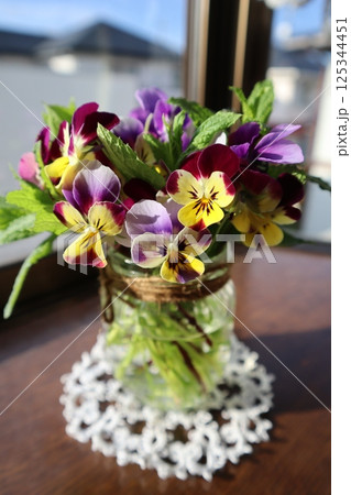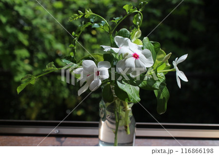 窓辺に切り戻したペチュニアとニチニチソウを生ける
