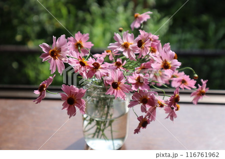 朝陽を浴びる窓辺の桃色たんぽぽ