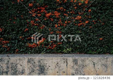 Vibrant orange berries against a lush green backdrop and concrete wall. Concept of natural beauty, growth, background, copy space for design or text. Interplay between nature and urban spaces