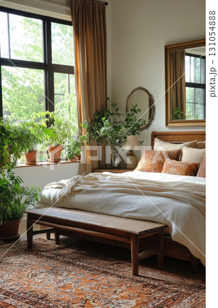 Cozy bedroom interiors with plants and natural light creating a warm inviting space