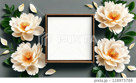 Elegant peonies in soft cream and orange surround a wooden frame, showcasing a blank space ready for artistic expression against a serene gray backdrop Generative AI