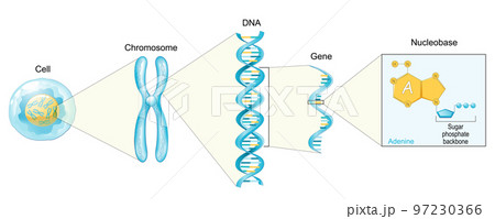 Structure of Cell. From Nucleobase like adenine to Gene, DNA and Chromosome.