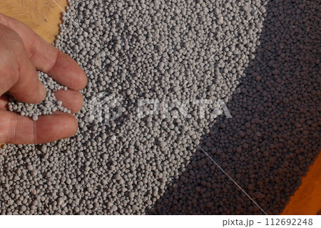 Gardener fertilizing plants with NPK fertilizer. Nourishing garden in Spring concept