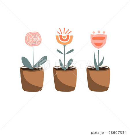 Set of doodle potted flowers in Scandinavian style. House or garden plants, vector hand drawn illustration in Scandinavian style. Abstract cartoon flowers in clay pots