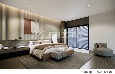 3d rendering mockup modern bedroom interior design and decoration with beige and grey color bedding fabric sofa grey carpet wooden blinds window and stripe wall.
