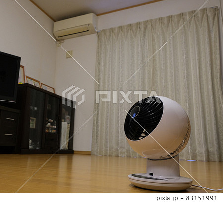 エアコンとサーキュレーター カーテンを閉しめて暖房効率アップ 節電のイメージ写真素材