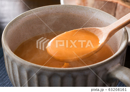 ほんわか湯気の立つ、オマール海老のビスクスープのアップ