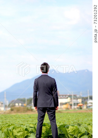 白菜畑で筑波山を眺めながらたたずむスーツ姿の男性