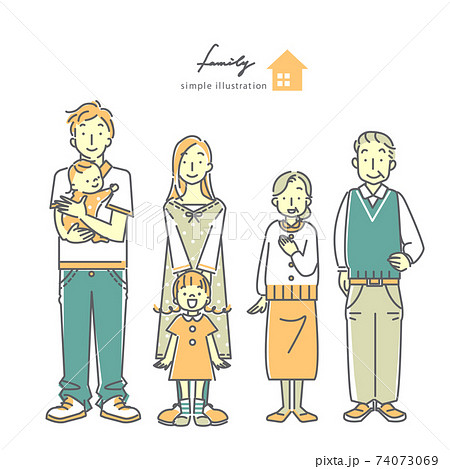 三世代家族のシンプルなパステルカラーの線画イラスト