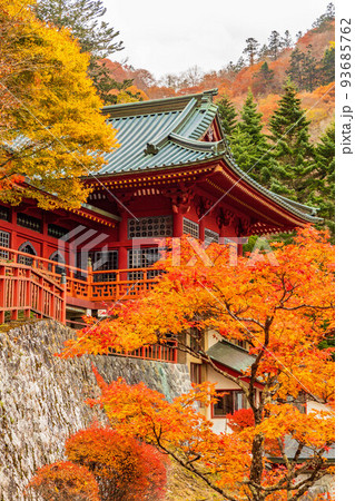 紅葉の山に五大堂が見える中禅寺「立木観音」の境内/栃木県日光市