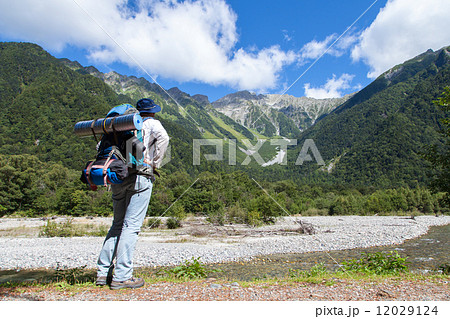「長野県」上高地で穂高連峰を見て歩くハイカー