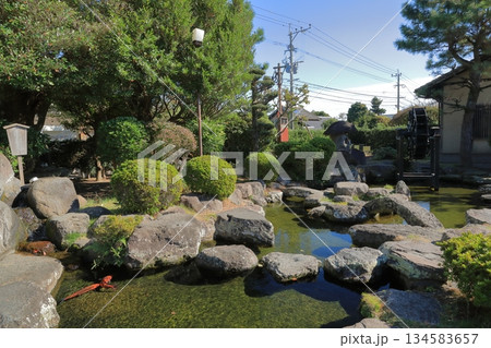 錦鯉が泳ぐ島原武家水車のある池の風景