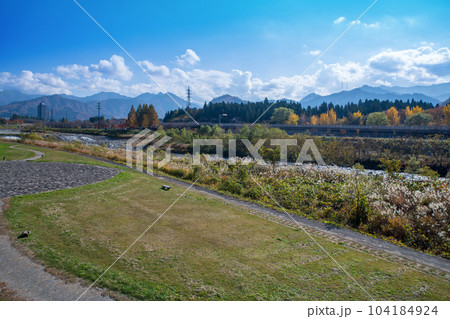 魚野川 立柄橋付近から越後湯沢駅方面 秋景色 新潟県湯沢町