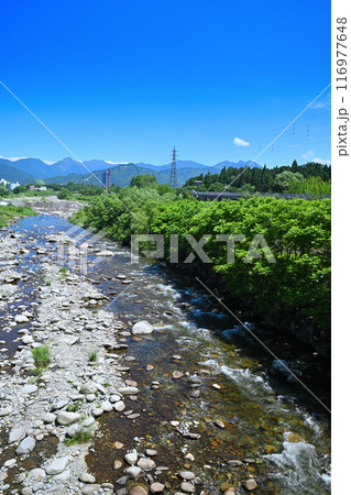 立柄橋からの風景 穴沢河川公園付近 魚野川下流 新潟県湯沢町