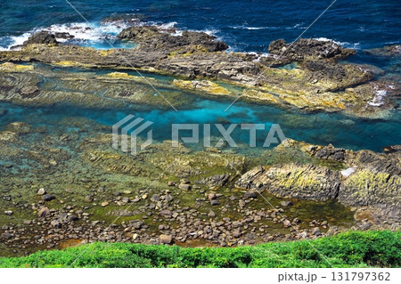 夏の竜飛岬 竜飛崎階段遊歩道から潮だまりの海岸を臨む