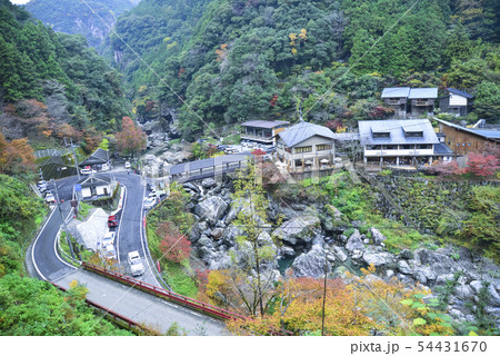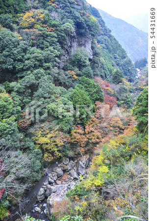 日本の紅葉時期の川の風景:山口県山口市の長門峡と阿武川