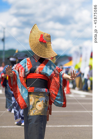 藍染浴衣と編み笠で踊る女性 西馬音内盆踊り 2024年 秋田県