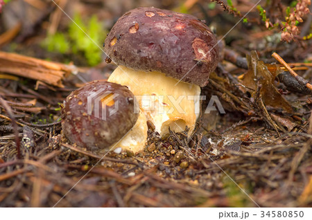 Bay Bolete or Boletus badius mushroom close up on a blurred background