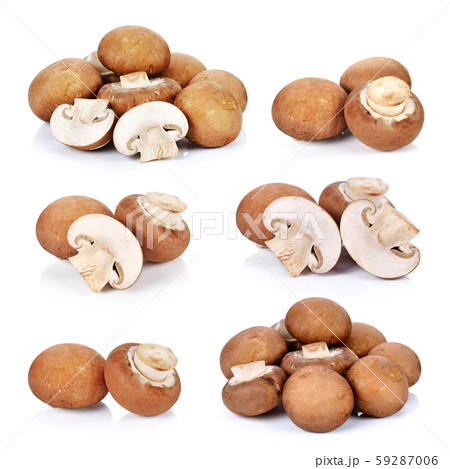 Set of White Button mushroom showing its textured cap and stem isolated on a white background.