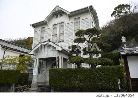 夕暮れにライトアップされた竹原市歴史民俗資料館 レトロな洋館建築と静かな町並み(広島県竹原市)