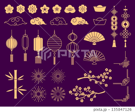 Oriental Asian lunar New Year vector elements of Japanese and Chinese flower blossoms. Clouds and waves, traditional lanterns and fireworks, bamboo, knots and paper fans for Chinese design elements