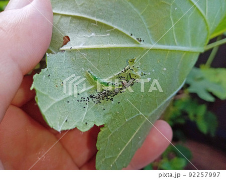 ワタノメイガの巻いた葉を開いたら糞だらけ