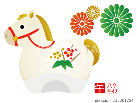 正月の縁起物とかわいい馬のセット 墨絵 門松 獅子舞 鏡餅 餅つき