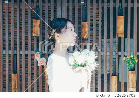 和の装飾を背景に佇むウェディングドレス姿の女性ポートレート