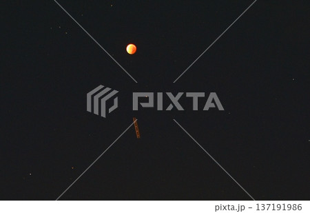 夜空の皆既月食のそばを飛行機が通過した光のライン