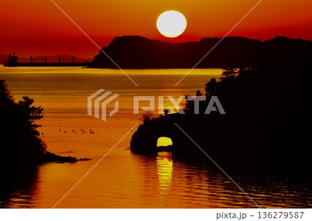 冬の夕日岬の岩穴から夕日のライン