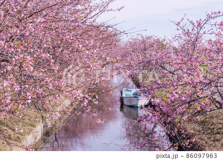 三重県松阪市 水路沿いに咲く笠松河津桜ロードとボート