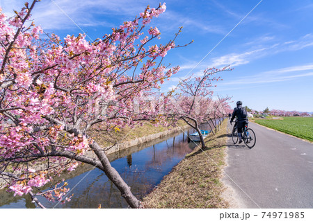 三重県松阪市 水路沿いに咲く笠松河津桜ロードとオートバイ