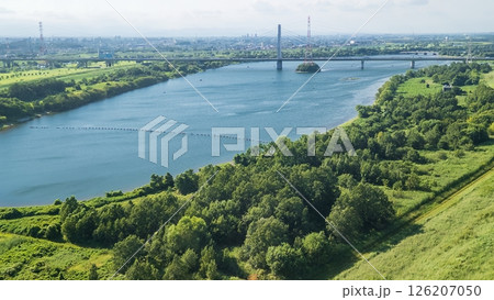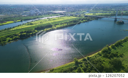 埼玉県戸田市の彩湖にかかる幸魂大橋を空撮