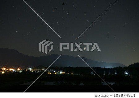 北杜市白州町、南アルプスの山並みに輝く宵の明星と麓の街灯り