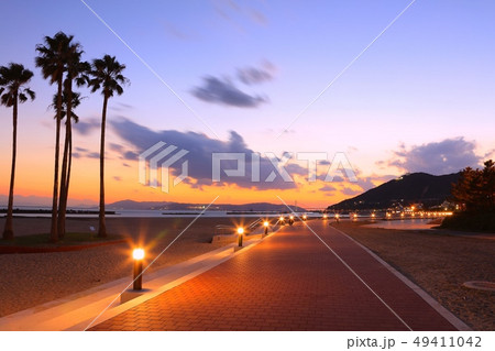 黄昏染まりゆく須磨海岸と遠景に明石海峡大橋、淡路島