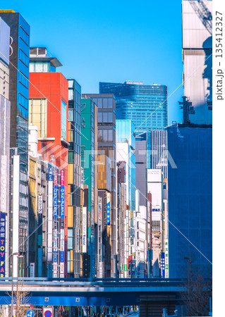 日本の東京都市景観師走。日本経済の憂鬱…ビル街に陰と光…奥は銀座四丁目。その奥に日本橋一丁目再開発