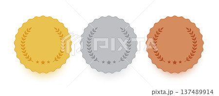 Set of round 3D award badges in gold, silver, bronze, and rose gold with laurel wreaths. Perfect for champion medals, certificates, or ranking icons. Isolated vector design.