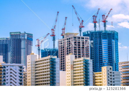日本の東京都市景観 建設中の豊海地区・タワーマンションなどを望む。手前は都営勝どき五丁目アパート…