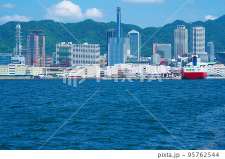 三宮のビル群と神戸港に停泊中の宮崎カーフェリーこうべエキスプレス 兵庫県神戸市中央区