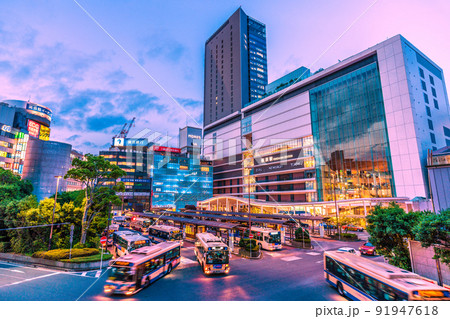 日本の横浜都市景観 桜木町駅(南改札・東口)や駅前の横浜ランドマークタワーなどを望む