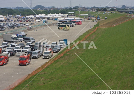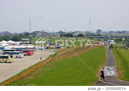 第71回利根川水系連合 総合水防演習。堤防道路から会場を望む。深谷市 国土交通省。7/27