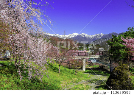 桜咲く諏訪峡園地から谷川連峰の眺め