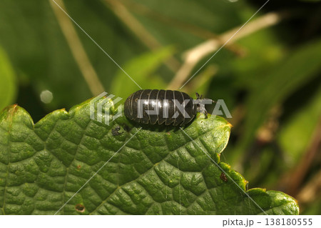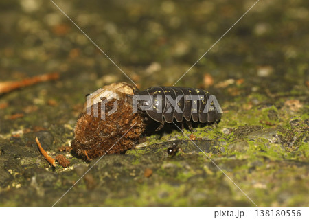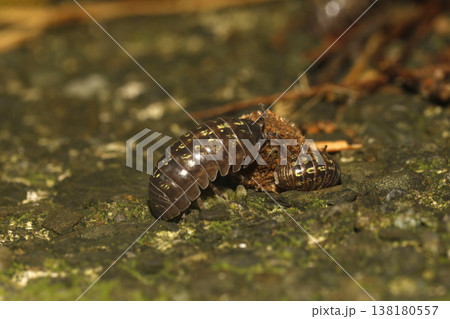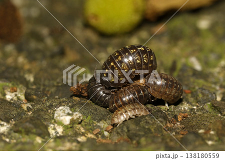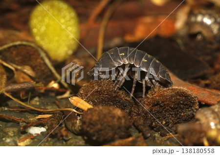 朽ち木に雌の黄色い紋のあるオカダンゴムシ(自然環境下生物マクロ撮影)
